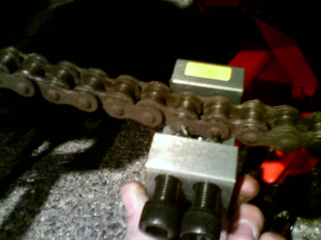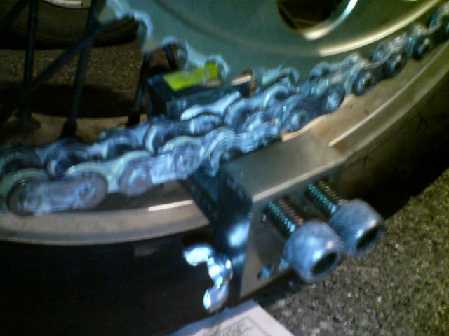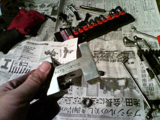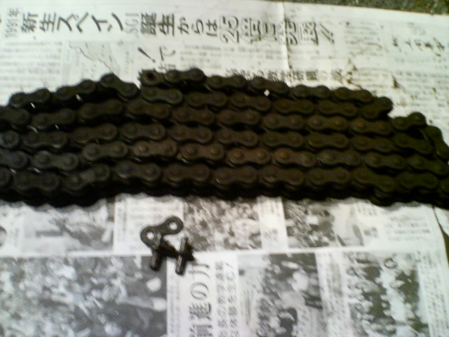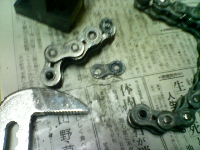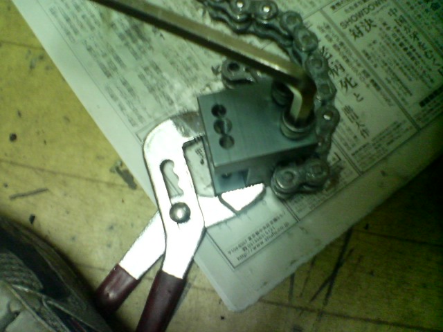 まず、ドライブスプロケットが見えるようにカバーを外す。 (すぷろけっとこうかん。。。参照) そしてチェーンを切る。今回使う道具はこちら。南海部品「オリジナルH型チェーン3ウェイツール」 チェーンカット、カシメ作業、クリップ作業などができるマルチツールである。 説明書をよく読んで設置する。 で、手前の2つのネジを六角レンチでまわしてやると、簡単にチェーンが切れた。切れたら引っ張ってやって抜くだけだ。古いチェーンは動きがかなり鈍く、ギトギトだった。 さて、それでは新しいチェーンをつけることにしよう。 まず、今回使うチェーンは『EKチェーン 525SRX 120LINK BLACK&BLACK』 VRXの純正リンク数は114であるが、ドライブスプロケットを1丁上げたので116に設定した。いずれにせよカットすることになる。新しいチェーンに汚れを付けたくなかったので家の中での作業だ。アンギラスをつかって固定し、六角レンチでグリグリと切る。新品だからなのか、結構硬い。 切れた。 あとは3ウェイツールを使ってプレートを圧着して、スプロケットにまわす。そして、カシメ作業である。 作業は簡単。先ほどのようにセッティングして、またグリグリと六角レンチを使って締め上げるだけである。 あとはカバーを付けて、張りの調整とタイヤの左右バランスを調整し、締め上げたら完成である。 カシメ作業は結構簡単であった。 (すぷろけっとこうかん。。。)